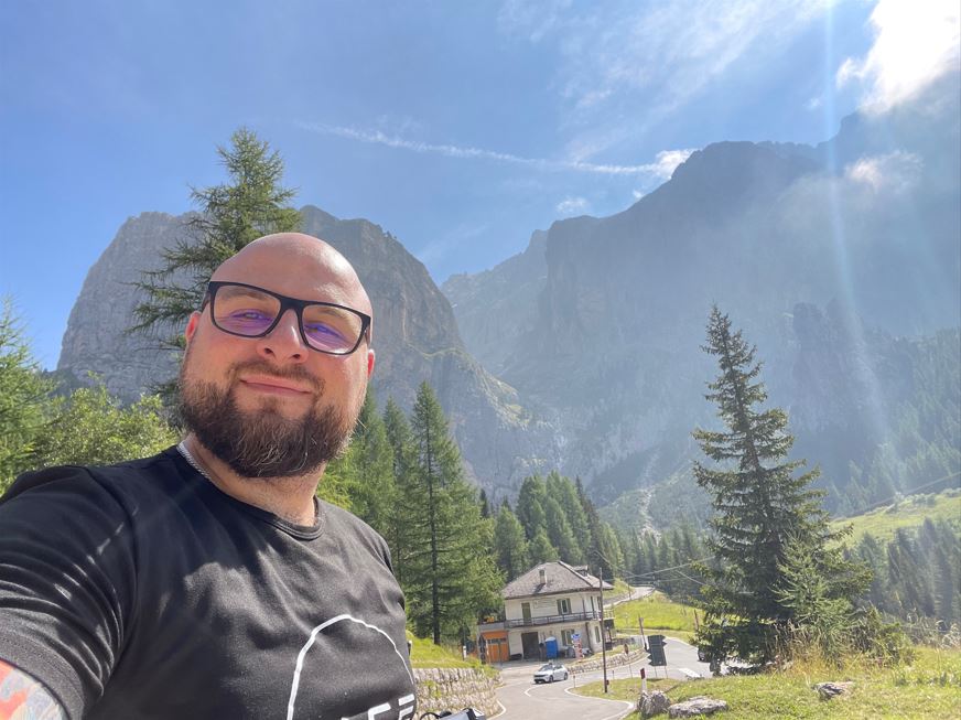 Przez ostatnie 4 dni mocno pędziliśmy. Rano śniadanie, na motocykl, jazda cały dzień właściwie bez przerwy bo nie jedliśmy nic w ciągu dnia, przyjazd do hotelu, kolacja, zgrywanie i ładowanie, sen. Odczuwaliśmy już dość duże zmęczenie więc postanowiliśmy dzisiaj zrobić sobie luźniejszy dzień i przejechać tylko do hotelu – 100km – w którym zostaniemy 2dni. Zjedliśmy śniadanko – jajko sadzone, wypiliśmy kawę i ruszyliśmy. Przejechaliśmy przez Passo Gardena w korkach. Widać rozpoczął się weekend i ludzie ruszyli na drogi. Pełno motocyklistów, samochodów, kamperów i rowerzystów. Po przejechaniu przełęczy zatrzymaliśmy się w pięknym miejscu przy drodze gdzie zrobiliśmy sobie kawkę i posiedzieliśmy chwilę. Kilkadziesiąt kilometrów już w miarę normalnymi drogami, na końcu kawałek autostrady pomiędzy Bolzano a Merano i dotarliśmy do Hotelu o 14. Wypakowaliśmy rzeczy, szybki prysznic i ruszyliśmy do sklepu, do którego wg nawigacji było 10min więc stwierdziliśmy, że pójdziemy pieszo. I było 10min. Ale z górki 🙂 Powrót z zakupami pod górę zajął 2 razy tyle i dał nam popalić, przede wszystkim ze względu na 32 stopnie i pełne słońce. Po powrocie Szymon poszedł korzystać z hotelowych uciech w postaci basenu oraz donoszonych do niego drinków, ja natomaist miałem chwilę aby zrobić porządki z relacjami, nagraniami, naładowaniem całego sprzętu i przygotowaniem się do jutrzejszego wyjazdu.