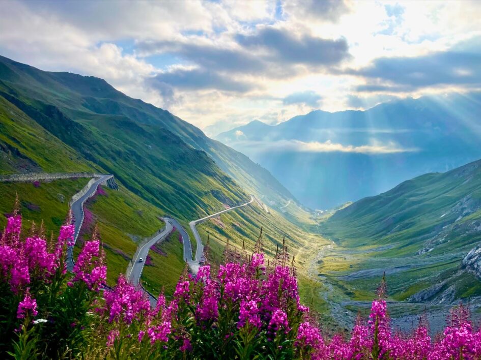 Ze względu na różnicę w priorytetach wyjazdowych, na ten dzień zaplanowałem wycieczkę samemu. Niestety nasz kalendarz tak się złożył, że na najbardziej popularną przełęcz miałem jechać akurat w sobotę. Nauczony doświadczeniem z przejazdu tą trasą z zeszłego roku – pomimo, że byliśmy już po sezonie i nie było tragicznie dużo aut – postanowiłem nie kusić losu i wyruszyć spod hotelu wraz ze wschodem słońca. Obudziłem się w okolicach 6:00 i co chwilę zerkałem przez balkon czy już zaczyna świtać. Na motocykl wsiadłem koło 6:20 i ruszyłem w stronę Stelvio. Nawigacja pokazywała mi ok 1,5h jazdy na szczyt. Na drodze dojazdowej do przełęczy złapałem się z czarnym porsche za którym zaczęliśmy pokonywać dynamicznie pierwsze winkle. Po kilku nawrotkach, gdy znaleźliśmy się już znacznie wyżej, musiałem odpuścić mojemu dwuśladowemu koledze i zatrzymać się aby się przebrać bo zaczęło robić mi się zimno. Szybko założyłem bieliznę termo i ruszyłem dalej na wspinaczkę. Droga była piękna, niemalże pusta, słońce utrzymywało się nisko na niebie przebijając się przez przemieszczającą się z wiatrem poranną mgłę. Było bardzo klimatycznie. Zatrzymałem się w kilku miejscach po drodze aby porobić fotki i filmiki małym dronem. Starałem się ogarnąć się z tym jak najszybciej aby w moim docelowym punkcie – parkingu widokowym zaraz pod przełęczą, być możliwie wcześnie by uniknąć tłumu ludzi. Zameldowałem się tam w okolicach 8 i ze względu na to, że oprócz mnie stało tam tylko kilka samochodów, w których prawdopodobnie ludzie jeszcze spali, wyciągnąłem drona DJI i nagrałem kilka ujęć. Bardzo chciałem to zrobić i się udało. Po nagraniach siadłem na murku z widokiem na pozawijaną drogę w dole i zjadłem śniadanie – mozzarellę i bułkę z oliwkami. Gdy po śniadaniu wjechałem na przełęcz stragany już częściowo były rozłożone, a ludzi powoli pojawiało się coraz więcej. Szybki szopping, podjazd na jeszcze jeden punkt widokowy żeby cyknąć kilka zdjęć i ruszyłem ku zjazdowi z drugiej strony, który moim zdaniem, pod względem funu z pokonywania zakrętów jest znacznie lepszy niż ta “widokowa” strona, której wszyscy robią zdjęcia. Następnym punktem według planu była przełęcz Gavia, przez którą rok temu również jechaliśmy dość późnym wieczorem, w mrozie, przez co niewiele z niej pamiętałem. Początek drogi był bardzo przyjemny, winkle, nawroty, miejscami dość ciasno, ale za to dość dobra widoczność do przodu, dzięki czemu można było łatwo wyprzedzać wlekące się samochody. Im wyżej tym agrafek było mniej, przeważały malownicze zakręty, na których można było przyjemnie dodać trochę gazu. Na przełęczy było już trochę pojazdów i ludzi, piękna pogoda, ciepło. Krótka przerwa na kupienie naklejek, krótkie nagrywki,zrobienie kilku zdjęć i ruszyłem dalej. Tutaj droga nie była już tak łaskawa. Pierwsze co mnie spotkało to bardzo gęsta mgła, już klika zakrętów niżej. Droga w wielu miejscach wąska na tyle, że motocykl miał ciężko żeby minąć się z osobówką. Ślepe zakręty, zza których niewiele widać i trzeba zwalniać niemal do zera. Gdy spotykały się dwa auta, to albo znajdywały miejsce w którym mogły się minąć na żyletki albo zaczynało się zaawansowane cofanie. Także powolutku, w korowodzie motocykli i samochodów, bez żadnych szaleństw, zjechałem na dół po czym udałem się na drogę do przełęczy Tonale. Droga lekko kręta lecz bez agrafek, a sam szczyt przełęczy jest ogromnym ośrodkiem narciarskim, który w lecie przemienia się w ośrodek trekingu górskiego. Minąłem znane mi z wyjazdów zimowych wyciągi po czym zatrzymałem się na przerwę, aby z pięknymi widokami w tle napić się kawy. Po przerwie ruszyłem dalej, kierując się już do Merano. Całe szczęście przez przypadek miałem włączone omijanie autostrad w nawigacji, dzięki czemu poprowadziła mnie piękną górską trasą z super asfaltem, wieloma winklami, która była pusta – a to dość rzadki widok w sierpniową sobotę z piękną pogodą. W międzyczasie umówiłem się z Szymonem w centrum Merano w pizzerii, która okazała się być raczej barem szybkiej obsługi pizzowej, gdzie sprzedają pizzę na kawałki. Wzięliśmy sobie po kilka kawałków i jako, że nie chciałem odchodzić od motocykla za daleko bo był pełen sprzętu, zjedliśmy pizzę stojąc przy nim. Następnie ja udałem się do naszego hotelu a Szymon został powłóczyć się jeszcze po centrum. Po powrocie wziąłem szybki prysznic i położyłem się żeby odpocząć popijając piwo. Była to dość intensywna trasa, a że bardzo słabo spałem poprzedniej nocy, byłem bardzo zmęczony. Wieczorem gdy wrócił Szymon poszliśmy na chwilę do basenu i wróciliśmy do pokoju na spanie.