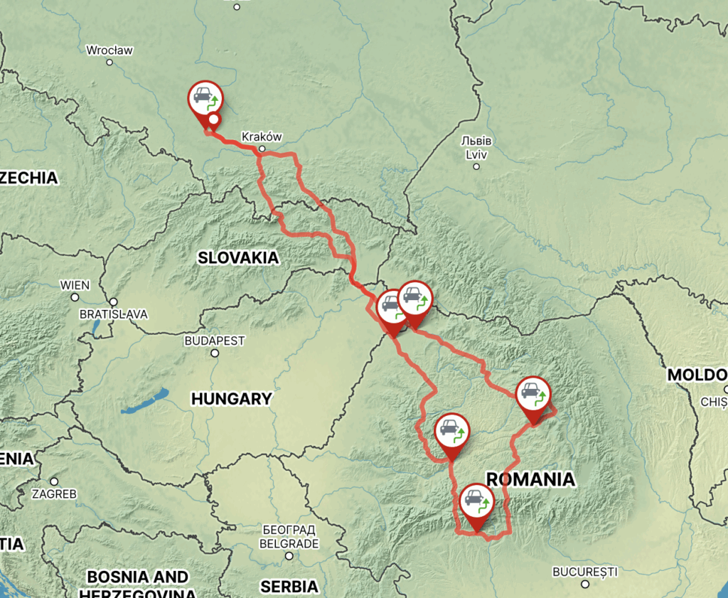 Zaznaczone na mapie samochodziki to miejsca, w których okolicy będziemy szukać noclegu. Wyjeżdżamy z Katowic o 8:00 z nadzieją, że obiad zjemy już w Rumunii.