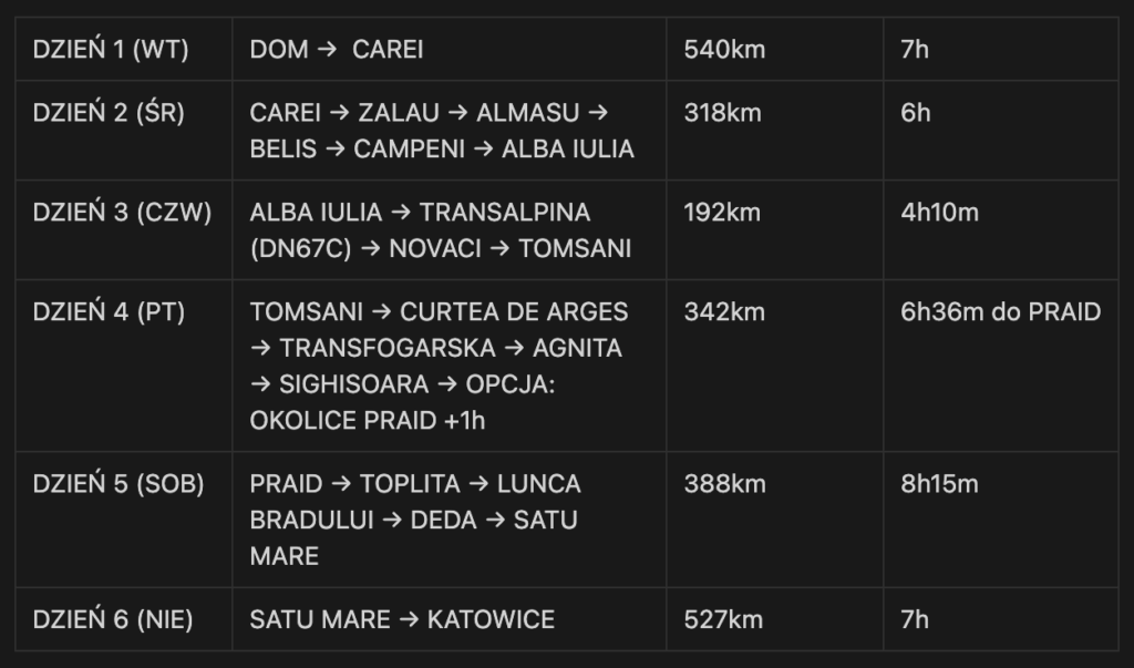 Już niebawem startujemy na wycieczkę motocyklową do Rumunii. Jedziemy w 3 motocykle: CBR, Vstrom i TRK702. Na całą wycieczkę mamy 6dni – tak, to mało jak na kraj do którego się wybieramy, przez co planowanie trasy nie było łatwe i dużo ciekawych miejsc niestety będziemy musieli ominąć. Z drugiej strony, jestem przekonany, że trasa którą ułożyłem będzie dla nas atrakcyjna i mocno intensywna. Plan jest ambitny i nastawienie mamy takie, że nie ważne ile kilometrów zrobimy – i tak będzie fajnie (o ile nie będzie cały czas lał deszcz :)). Trasa orientacyjnie wygląda tak: