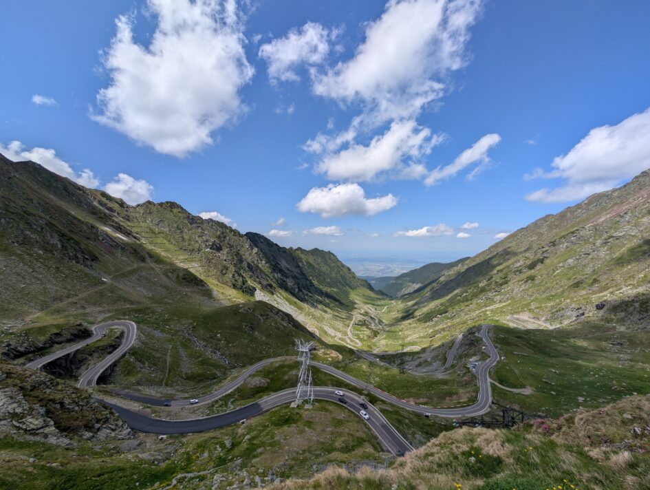 Dzisiaj nie było już mowy o ociąganiu się bo przed nami czekała główna atrakcja wyjazdu, czyli słynna trasa Transfogarska. O 9 wyruszyliśmy z hotelu by już po kilkunastu minutach znaleźć się na trasie. Jest to najpopularniejsze miejsce do zwiedzania motocyklem w Rumunii, co dało się dostrzec po ilości samochodów i innych motocykli. Tutaj asfalt nie jest już tak idealny jak na Alpinie i często jego jakość się zmienia. Są bardzo dobre fragmenty, które widać, że niedawno przeszły remont, ale jest też mnóstwo starszych, w których jest sporo dziur. W wielu miejscach ubytki są zalane wypełniaczem i wyglądają jak takie czarne węże na drodze – bardzo nieprzyjemne przy jeździe motocyklem, bo przy każdym najechaniu było uczucie poślizgu opony.
